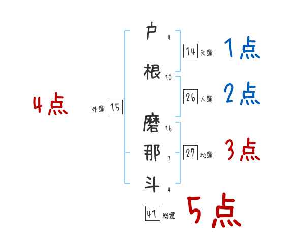 天運![]() | 戸根磨那斗さんの天運は14画の1つ星!人に対して優しいがストレスを溜め込みがち。人間関係のトラブルを避けるよう気をつけましょう。 家系が持つ宿命的な運勢を表します。祖先から受け継いだ苗字ですので自分の力が及びません。家柄を象徴します。 |