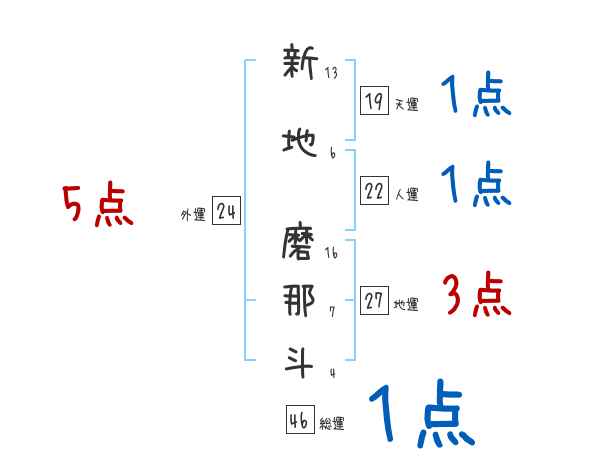 外運![]() | 新地磨那斗さんの外運は24画の5つ星!家庭運が良く順調な人生。金運にも恵まれる。 生活面を象徴する運勢です。外部から受ける影響力を表し、結婚運、家庭運や職場、環境への順応性を表します。 |