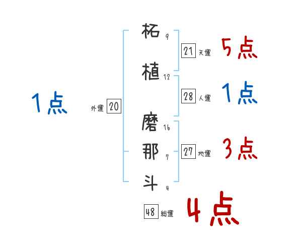 | 天運  | 柘植磨那斗さんの天運は21画の5つ星!統率力がある。独立し成功する。名誉を手に入れる。家系が持つ宿命的な運勢を表します。祖先から受け継いだ苗字ですので自分の力が及びません。家柄を象徴します。 |
