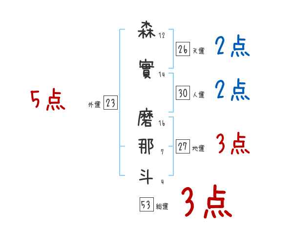 総運![]() | 森實磨那斗さんの総運は53画の3つ星!やや見栄っ張りで虚栄心がある。散財に注意。 あなたの人生を表す1番重要な運勢です。生涯を通じて影響する総合運となり、主に50歳以降の晩年期に影響を及ぼします。 |