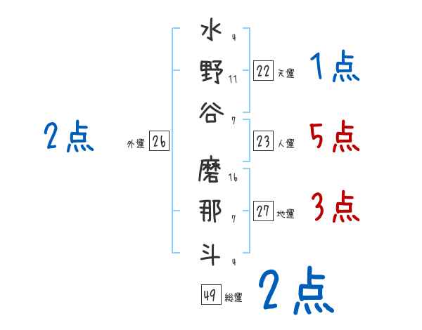 外運![]() | 水野谷磨那斗さんの外運は26画の2つ星!波瀾万丈かも。信頼できる人を大事にしましょう。 生活面を象徴する運勢です。外部から受ける影響力を表し、結婚運、家庭運や職場、環境への順応性を表します。 |