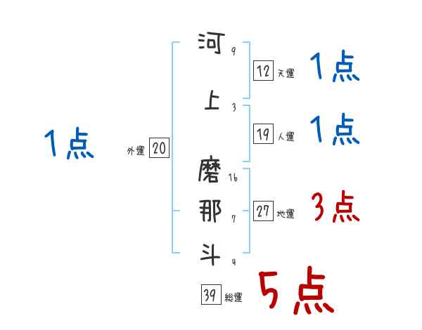 天運![]() | 河上磨那斗さんの天運は12画の1つ星!簡単な失敗で諦めてしまいやすいかも。着実に行動すると良いでしょう。 家系が持つ宿命的な運勢を表します。祖先から受け継いだ苗字ですので自分の力が及びません。家柄を象徴します。 |