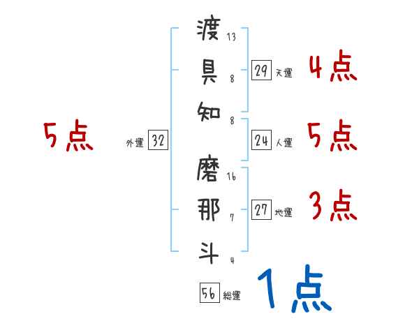 渡具知磨那斗さんの画数の鑑定結果
