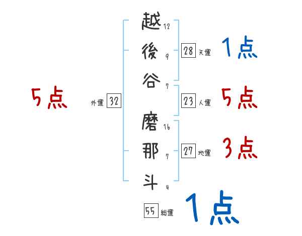 外運![]() | 越後谷磨那斗さんの外運は32画の5つ星!柔軟性があり成功する。チャンスが多く金運が良い。 生活面を象徴する運勢です。外部から受ける影響力を表し、結婚運、家庭運や職場、環境への順応性を表します。 |
