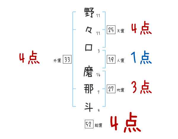 外運![]() | 野々口磨那斗さんの外運は33画の4つ星!権力志向でプライドが高い。勇気があり運を切り開き成功する。 生活面を象徴する運勢です。外部から受ける影響力を表し、結婚運、家庭運や職場、環境への順応性を表します。 |