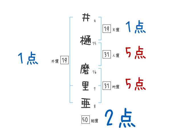 外運![]() | 井樋磨里亜さんの外運は19画の1つ星!優れた才能を持ちますが、協調性が足りないことも。周りの人と協力する事を意識しましょう。 生活面を象徴する運勢です。外部から受ける影響力を表し、結婚運、家庭運や職場、環境への順応性を表します。 |