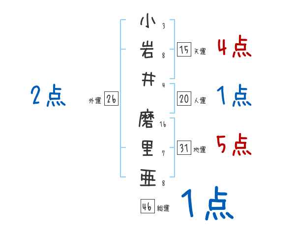 外運![]() | 小岩井磨里亜さんの外運は26画の2つ星!波瀾万丈かも。信頼できる人を大事にしましょう。 生活面を象徴する運勢です。外部から受ける影響力を表し、結婚運、家庭運や職場、環境への順応性を表します。 |