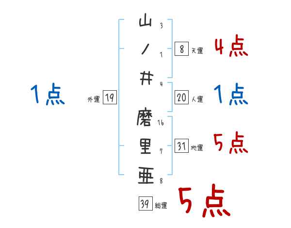 外運![]() | 山ノ井磨里亜さんの外運は19画の1つ星!優れた才能を持ちますが、協調性が足りないことも。周りの人と協力する事を意識しましょう。 生活面を象徴する運勢です。外部から受ける影響力を表し、結婚運、家庭運や職場、環境への順応性を表します。 |