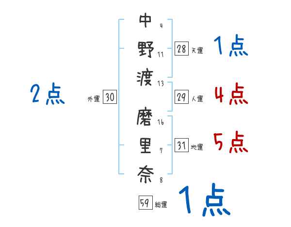 外運![]() | 中野渡磨里奈さんの外運は30画の2つ星!浮き沈みの激しさに注意しましょう。 生活面を象徴する運勢です。外部から受ける影響力を表し、結婚運、家庭運や職場、環境への順応性を表します。 |