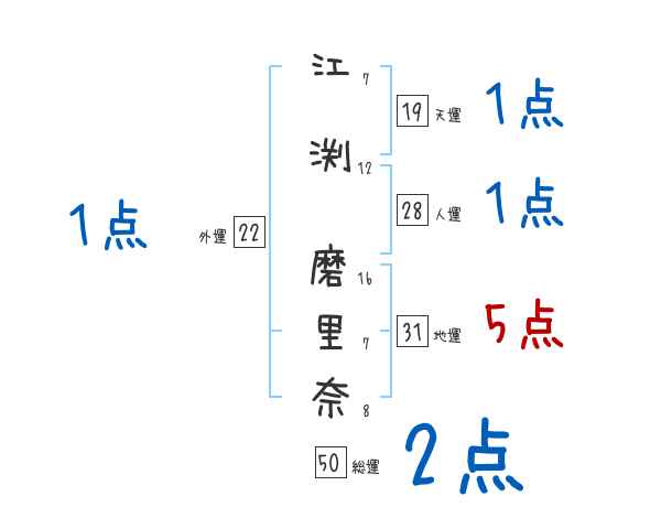 総運![]() | 江渕磨里奈さんの総運は50画の2つ星!浮き沈みが激しく不安定。しりすぼみに衰退しやすいので注意しましょう。 あなたの人生を表す1番重要な運勢です。生涯を通じて影響する総合運となり、主に50歳以降の晩年期に影響を及ぼします。 |