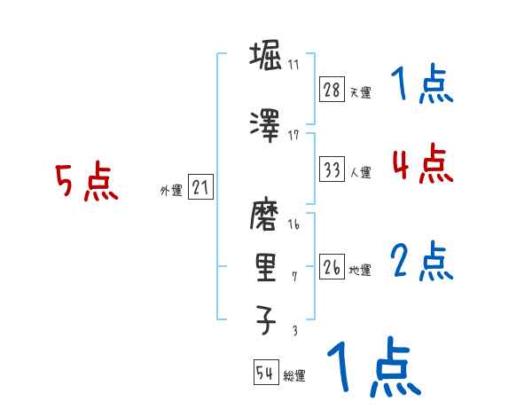 外運![]() | 堀澤磨里子さんの外運は21画の5つ星!統率力がある。独立し成功する。名誉を手に入れる。 生活面を象徴する運勢です。外部から受ける影響力を表し、結婚運、家庭運や職場、環境への順応性を表します。 |