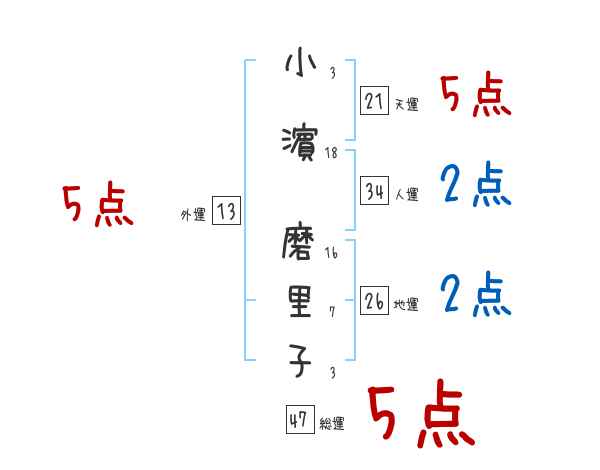 総運![]() | 小濵磨里子さんの総運は47画の5つ星!実力が開花し発展する円満な人生。財に恵まれる。 あなたの人生を表す1番重要な運勢です。生涯を通じて影響する総合運となり、主に50歳以降の晩年期に影響を及ぼします。 |