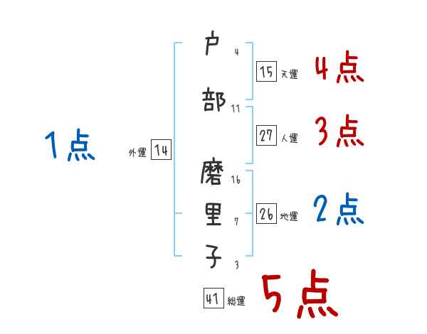 | 天運  | 戸部磨里子さんの天運は15画の4つ星!人徳があり出世する。順調に物事を進め円満な人生。家系が持つ宿命的な運勢を表します。祖先から受け継いだ苗字ですので自分の力が及びません。家柄を象徴します。 |