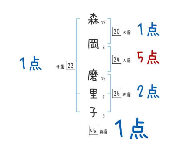 総運![]() | 森岡磨里子さんの総運は46画の1つ星!迷走することが多く苦労するかも。目先のことにとらわれないように。 あなたの人生を表す1番重要な運勢です。生涯を通じて影響する総合運となり、主に50歳以降の晩年期に影響を及ぼします。 |