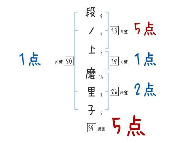 総運![]() | 段ノ上磨里子さんの総運は39画の5つ星!社交性に優れ人望が厚い。人の上に立ち成功する。 あなたの人生を表す1番重要な運勢です。生涯を通じて影響する総合運となり、主に50歳以降の晩年期に影響を及ぼします。 |