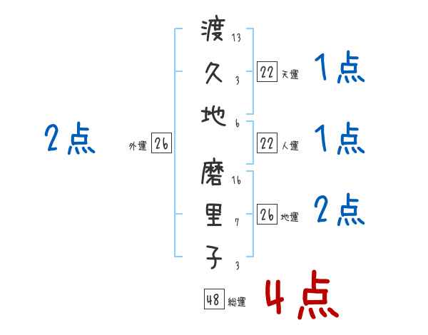 地運![]() | 渡久地磨里子さんの地運は26画の2つ星!波瀾万丈かも。信頼できる人を大事にしましょう。 個性を表す基礎的な運勢です。性格形成や対人関係、行動力など家庭環境に影響されます。主に誕生してから20歳くらいまでの若年期の運勢を表します。 |