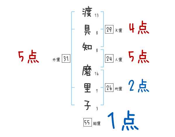 外運![]() | 渡具知磨里子さんの外運は31画の5つ星!社交性があり判断力に優れる。順風満帆な人生で円満な生活。 生活面を象徴する運勢です。外部から受ける影響力を表し、結婚運、家庭運や職場、環境への順応性を表します。 |
