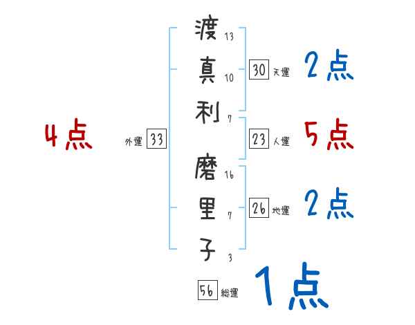 天運![]() | 渡真利磨里子さんの天運は30画の2つ星!浮き沈みの激しさに注意しましょう。 家系が持つ宿命的な運勢を表します。祖先から受け継いだ苗字ですので自分の力が及びません。家柄を象徴します。 |