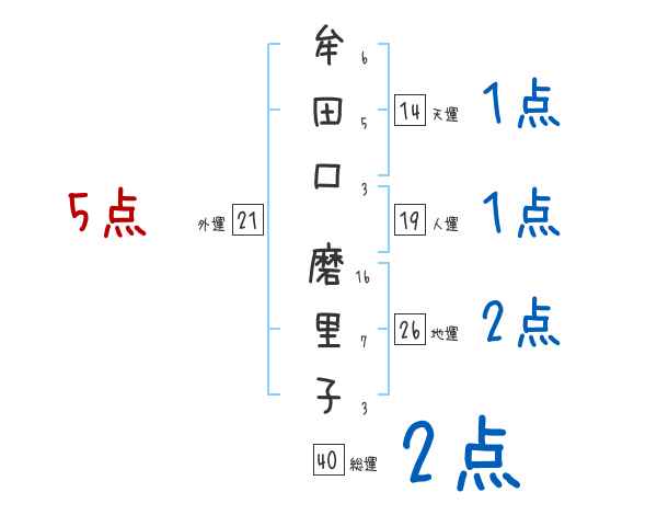 外運![]() | 牟田口磨里子さんの外運は21画の5つ星!統率力がある。独立し成功する。名誉を手に入れる。 生活面を象徴する運勢です。外部から受ける影響力を表し、結婚運、家庭運や職場、環境への順応性を表します。 |