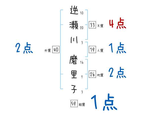 天運![]() | 逆瀬川磨里子さんの天運は33画の4つ星!権力志向でプライドが高い。勇気があり運を切り開き成功する。 家系が持つ宿命的な運勢を表します。祖先から受け継いだ苗字ですので自分の力が及びません。家柄を象徴します。 |