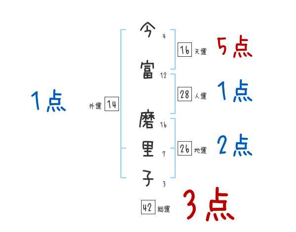 外運![]() | 今富磨里子さんの外運は14画の1つ星!人に対して優しいがストレスを溜め込みがち。人間関係のトラブルを避けるよう気をつけましょう。 生活面を象徴する運勢です。外部から受ける影響力を表し、結婚運、家庭運や職場、環境への順応性を表します。 |