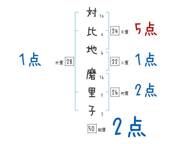 外運![]() | 対比地磨里子さんの外運は28画の1つ星!家庭環境に注意。スポーツで活躍できる能力があるかも。 生活面を象徴する運勢です。外部から受ける影響力を表し、結婚運、家庭運や職場、環境への順応性を表します。 |