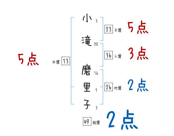 天運![]() | 小滝磨里子さんの天運は23画の5つ星!想像力に優れ活力がある。一代で成功し名誉を手に入れる。 家系が持つ宿命的な運勢を表します。祖先から受け継いだ苗字ですので自分の力が及びません。家柄を象徴します。 |