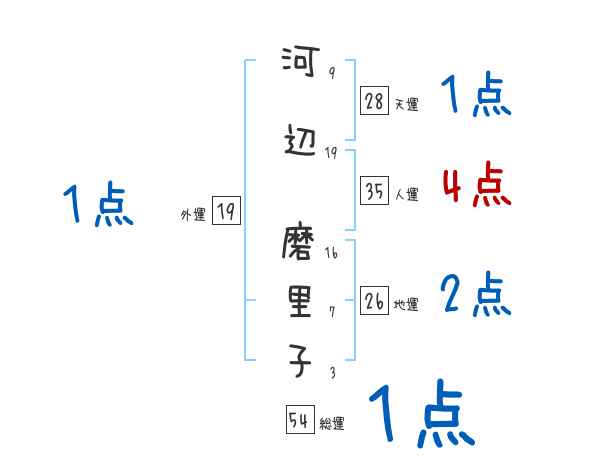 天運![]() | 河辺磨里子さんの天運は28画の1つ星!家庭環境に注意。スポーツで活躍できる能力があるかも。 家系が持つ宿命的な運勢を表します。祖先から受け継いだ苗字ですので自分の力が及びません。家柄を象徴します。 |