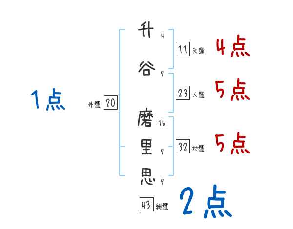 天運![]() | 升谷磨里思さんの天運は11画の4つ星!着実に富や地位を得る幸運な人生。 家系が持つ宿命的な運勢を表します。祖先から受け継いだ苗字ですので自分の力が及びません。家柄を象徴します。 |