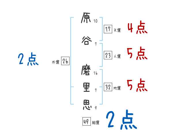 天運![]() | 原谷磨里思さんの天運は17画の4つ星!積極的な行動力。地位を気づき財産を手に入れる。純粋な心と直感力。 家系が持つ宿命的な運勢を表します。祖先から受け継いだ苗字ですので自分の力が及びません。家柄を象徴します。 |
