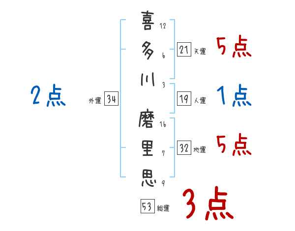 総運![]() | 喜多川磨里思さんの総運は53画の3つ星!やや見栄っ張りで虚栄心がある。散財に注意。 あなたの人生を表す1番重要な運勢です。生涯を通じて影響する総合運となり、主に50歳以降の晩年期に影響を及ぼします。 |