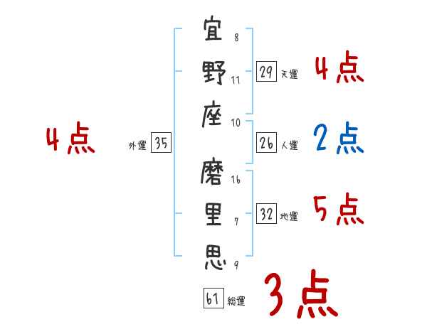 外運![]() | 宜野座磨里思さんの外運は35画の4つ星!温厚な性格で感受性が高い。穏和な性格で人望が厚い。 生活面を象徴する運勢です。外部から受ける影響力を表し、結婚運、家庭運や職場、環境への順応性を表します。 |