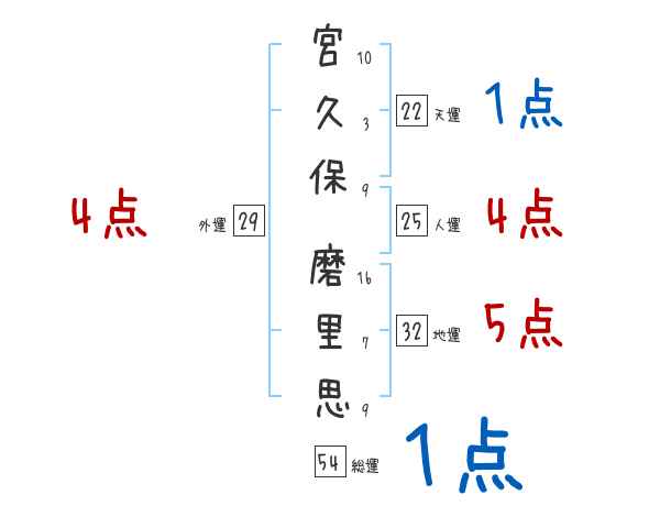地運![]() | 宮久保磨里思さんの地運は32画の5つ星!柔軟性があり成功する。チャンスが多く金運が良い。 個性を表す基礎的な運勢です。性格形成や対人関係、行動力など家庭環境に影響されます。主に誕生してから20歳くらいまでの若年期の運勢を表します。 |