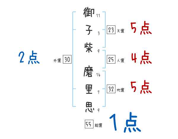 天運![]() | 御子柴磨里思さんの天運は23画の5つ星!想像力に優れ活力がある。一代で成功し名誉を手に入れる。 家系が持つ宿命的な運勢を表します。祖先から受け継いだ苗字ですので自分の力が及びません。家柄を象徴します。 |