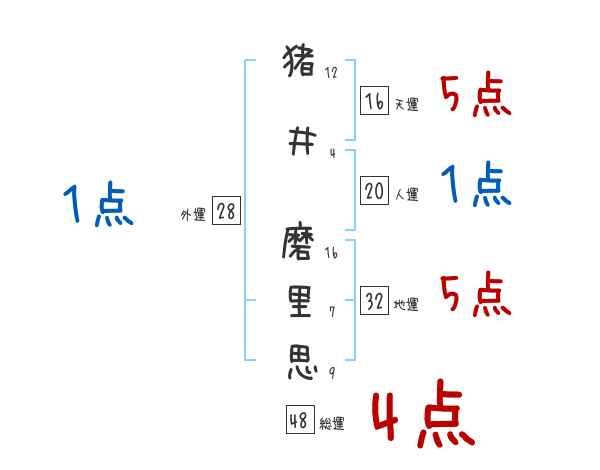 天運![]() | 猪井磨里思さんの天運は16画の5つ星!人望が厚く大きく発展する。逆転成功が見える。 家系が持つ宿命的な運勢を表します。祖先から受け継いだ苗字ですので自分の力が及びません。家柄を象徴します。 |