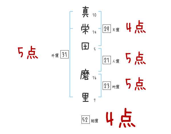 人運![]() | 真栄田磨里さんの人運は21画の5つ星!統率力がある。独立し成功する。名誉を手に入れる。 性格や才能などを表す2番目に重要な運勢です。人間関係や協調性、社会的な成功に影響します。主に20歳から50歳ぐらいまでの中年期の運勢を表します。 |