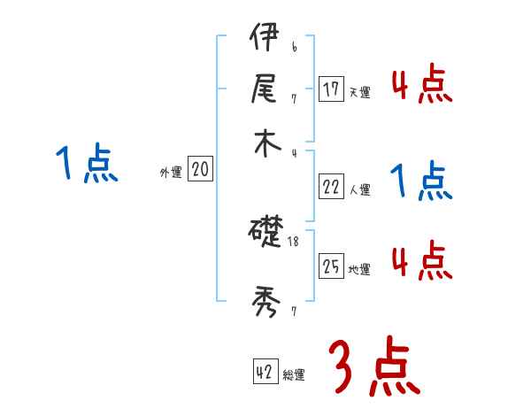 人運![]() | 伊尾木礎秀さんの人運は22画の1つ星!努力することが苦手ないっぽう手先が器用。芸術性にも優れる。 性格や才能などを表す2番目に重要な運勢です。人間関係や協調性、社会的な成功に影響します。主に20歳から50歳ぐらいまでの中年期の運勢を表します。 |