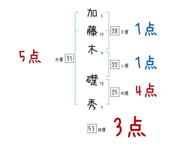 総運![]() | 加藤木礎秀さんの総運は53画の3つ星!やや見栄っ張りで虚栄心がある。散財に注意。 あなたの人生を表す1番重要な運勢です。生涯を通じて影響する総合運となり、主に50歳以降の晩年期に影響を及ぼします。 |