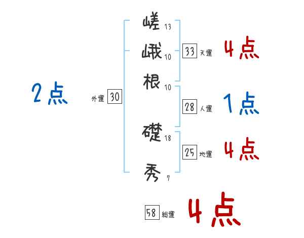 総運![]() | 嵯峨根礎秀さんの総運は58画の4つ星!安定した生活。大器晩成タイプ。 あなたの人生を表す1番重要な運勢です。生涯を通じて影響する総合運となり、主に50歳以降の晩年期に影響を及ぼします。 |