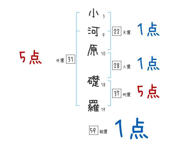 総運![]() | 小河原礎羅さんの総運は59画の1つ星!意志の弱さであきらめることが多いかも。粘り強さが必要。 あなたの人生を表す1番重要な運勢です。生涯を通じて影響する総合運となり、主に50歳以降の晩年期に影響を及ぼします。 |