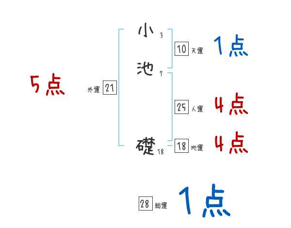 総運![]() | 小池礎さんの総運は28画の1つ星!家庭環境に注意。スポーツで活躍できる能力があるかも。 あなたの人生を表す1番重要な運勢です。生涯を通じて影響する総合運となり、主に50歳以降の晩年期に影響を及ぼします。 |