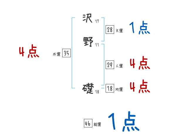 外運![]() | 沢野礎さんの外運は35画の4つ星!温厚な性格で感受性が高い。穏和な性格で人望が厚い。 生活面を象徴する運勢です。外部から受ける影響力を表し、結婚運、家庭運や職場、環境への順応性を表します。 |