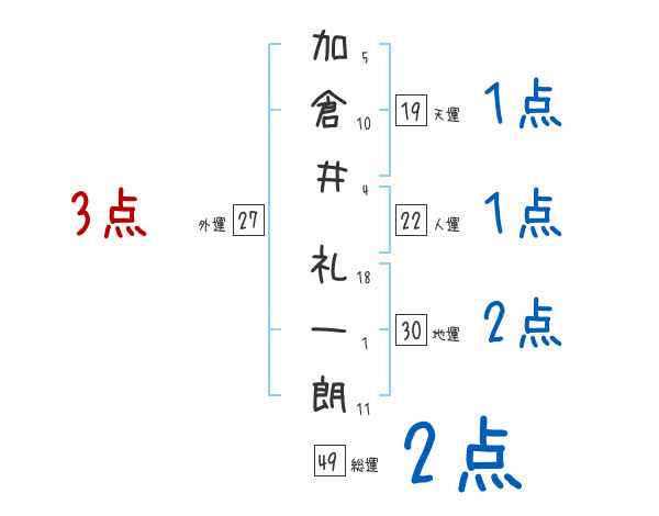 天運![]() | 加倉井礼一朗さんの天運は19画の1つ星!優れた才能を持ちますが、協調性が足りないことも。周りの人と協力する事を意識しましょう。 家系が持つ宿命的な運勢を表します。祖先から受け継いだ苗字ですので自分の力が及びません。家柄を象徴します。 |