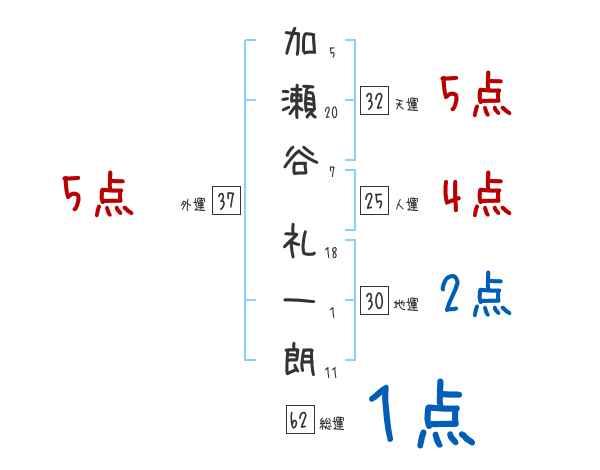 天運![]() | 加瀬谷礼一朗さんの天運は32画の5つ星!柔軟性があり成功する。チャンスが多く金運が良い。 家系が持つ宿命的な運勢を表します。祖先から受け継いだ苗字ですので自分の力が及びません。家柄を象徴します。 |