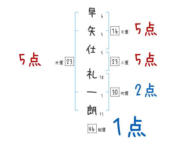 外運![]() | 早矢仕礼一朗さんの外運は23画の5つ星!想像力に優れ活力がある。一代で成功し名誉を手に入れる。 生活面を象徴する運勢です。外部から受ける影響力を表し、結婚運、家庭運や職場、環境への順応性を表します。 |