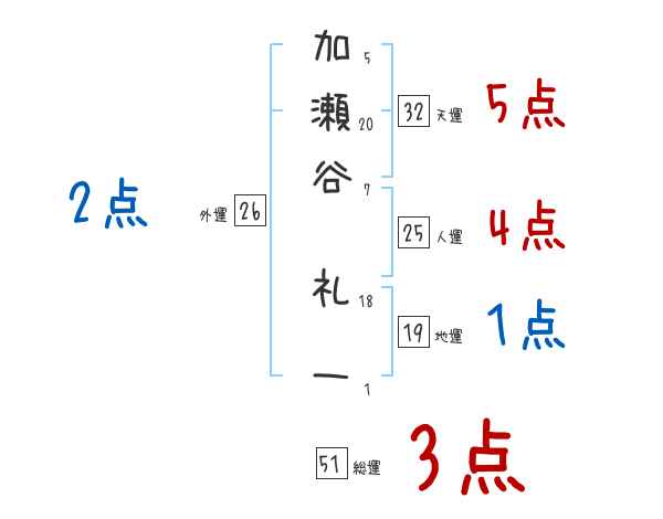 天運![]() | 加瀬谷礼一さんの天運は32画の5つ星!柔軟性があり成功する。チャンスが多く金運が良い。 家系が持つ宿命的な運勢を表します。祖先から受け継いだ苗字ですので自分の力が及びません。家柄を象徴します。 |