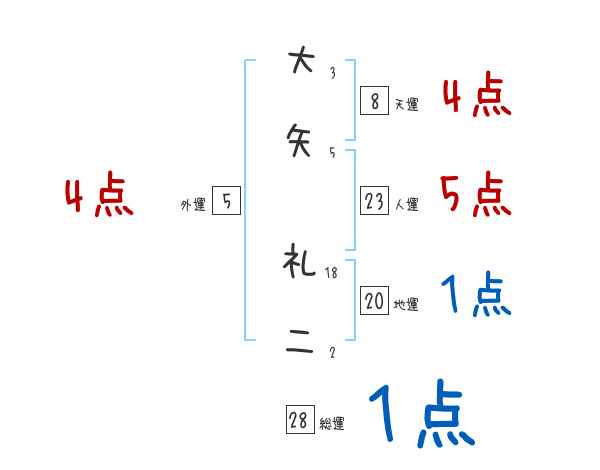 総運![]() | 大矢礼二さんの総運は28画の1つ星!家庭環境に注意。スポーツで活躍できる能力があるかも。 あなたの人生を表す1番重要な運勢です。生涯を通じて影響する総合運となり、主に50歳以降の晩年期に影響を及ぼします。 |