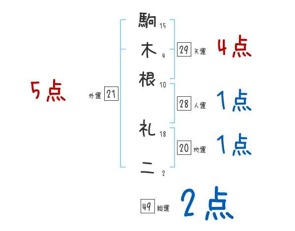 外運![]() | 駒木根礼二さんの外運は21画の5つ星!統率力がある。独立し成功する。名誉を手に入れる。 生活面を象徴する運勢です。外部から受ける影響力を表し、結婚運、家庭運や職場、環境への順応性を表します。 |