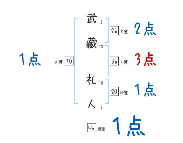 総運![]() | 武藏礼人さんの総運は46画の1つ星!迷走することが多く苦労するかも。目先のことにとらわれないように。 あなたの人生を表す1番重要な運勢です。生涯を通じて影響する総合運となり、主に50歳以降の晩年期に影響を及ぼします。 |