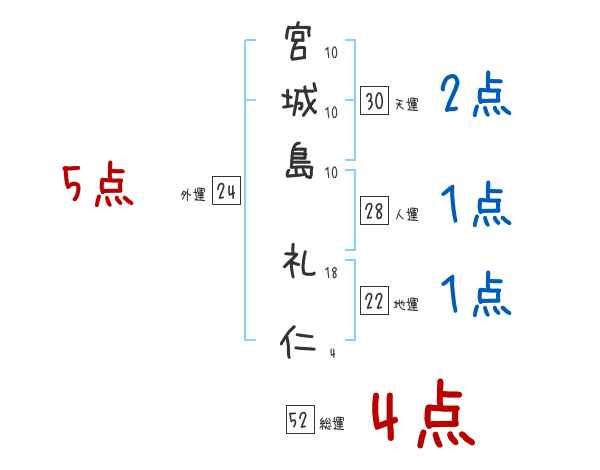外運![]() | 宮城島礼仁さんの外運は24画の5つ星!家庭運が良く順調な人生。金運にも恵まれる。 生活面を象徴する運勢です。外部から受ける影響力を表し、結婚運、家庭運や職場、環境への順応性を表します。 |